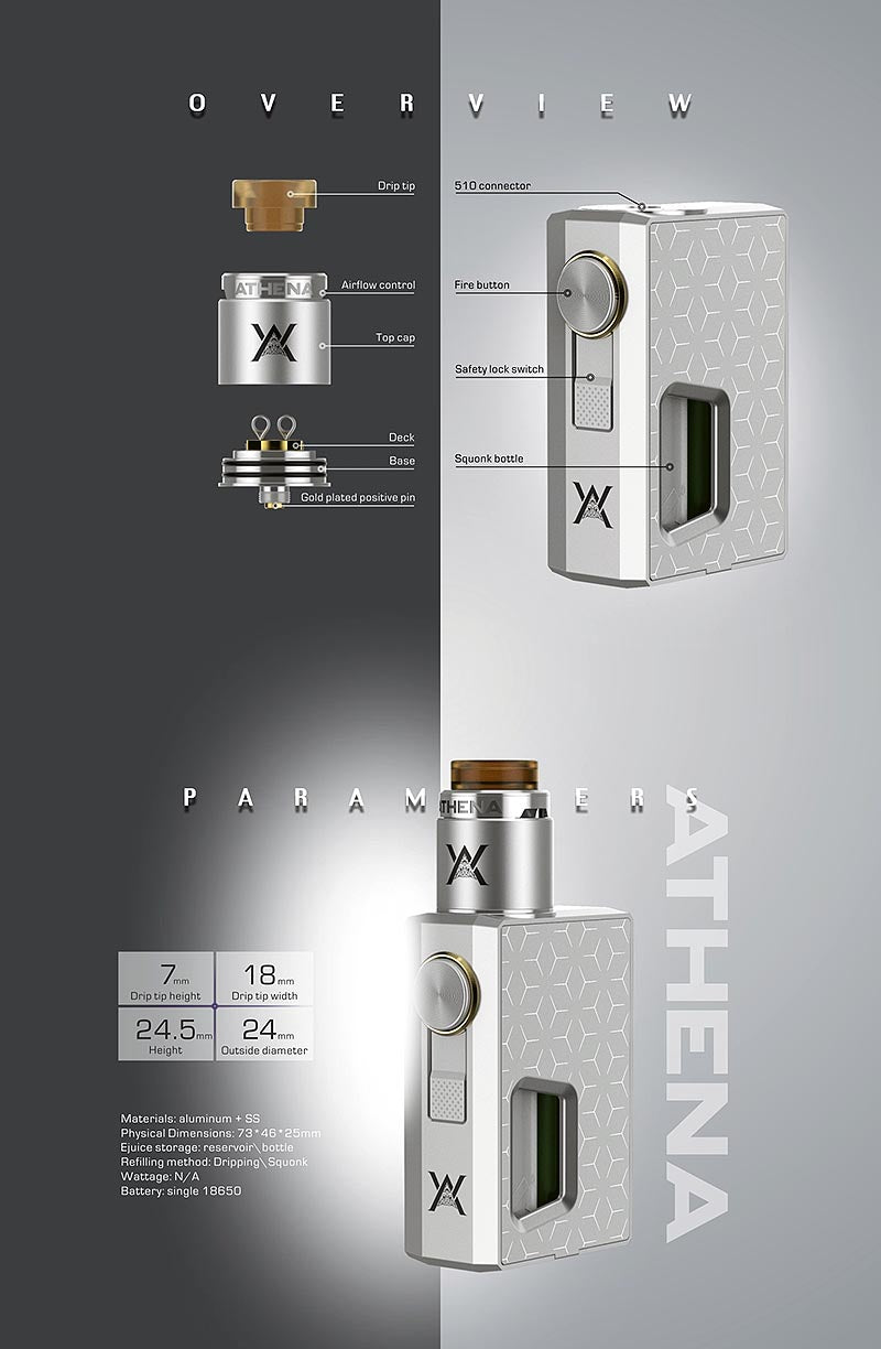 The Athena Squonk Kit by GeekVape comes with a mechanical squonk mod and a squonk RDA with 6.5ml juice tank/bottle. Being compact, lightweight and powerful, take this kit with you anywhere to show off your sick clouds. No worries, it comes equipped with a safety lock switch to prevent misfire. The RDA is designed with a top angled airflow system to avoid leakage.