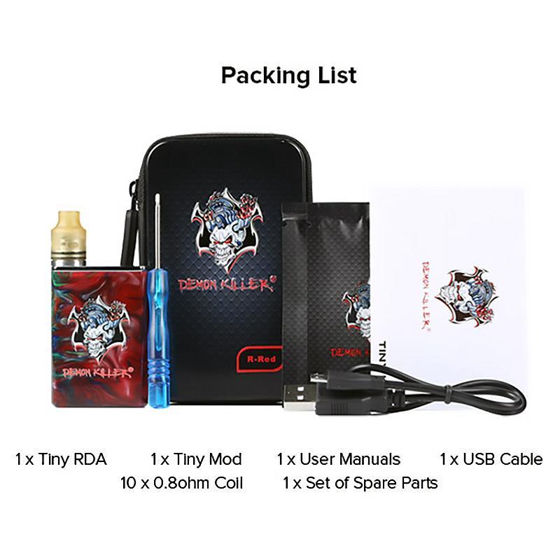 The Demon Killer Tiny Kit is one you do not want to miss out on. This is one of the few compact-size systems out there that features a rebuildable section. Backed by an 800mAh battery, the device has a textured body, paired with a beautiful two-post, single coil RDA (rebuildable dripping atomizer).