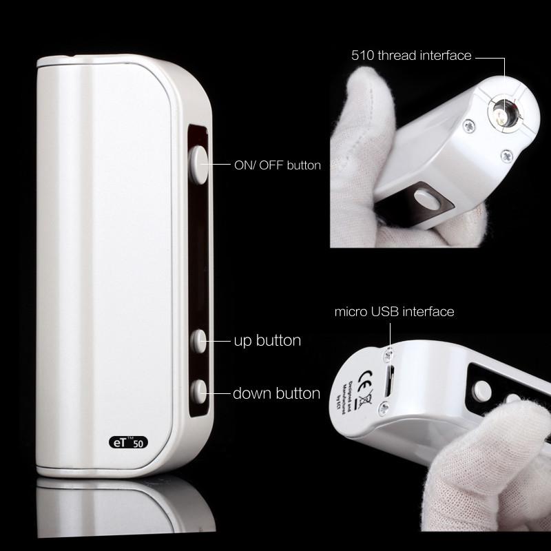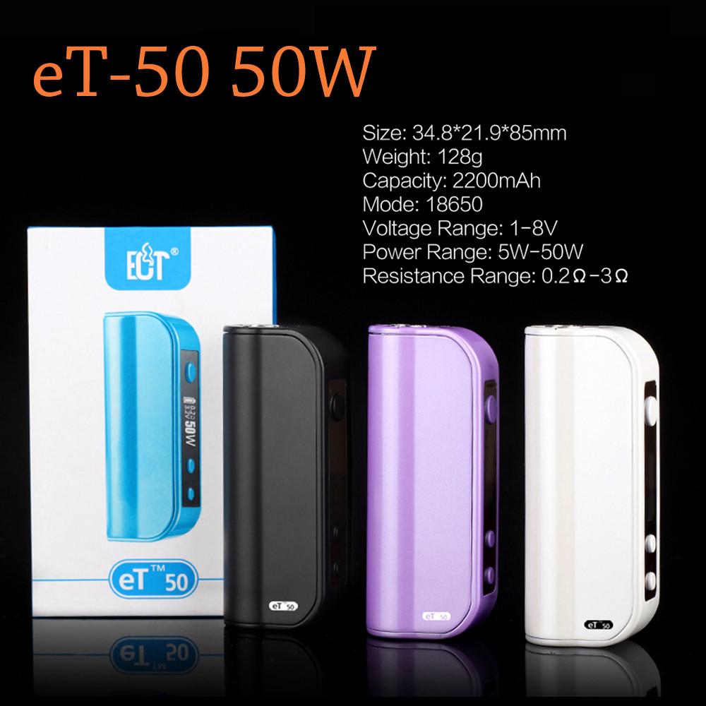 The ECT eT 50W (ET50) is a box mod vape with a long-lasting 2200mah built-in battery.