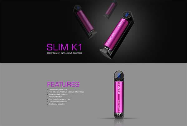 The Efest Slim K1 Charger is a very well-made, cost efficient charger. This is the perfect portable charger for you on-the-goers. This charger is a single slot port and is powered by a micro USB cable. Has all the safety features you need in your charger.