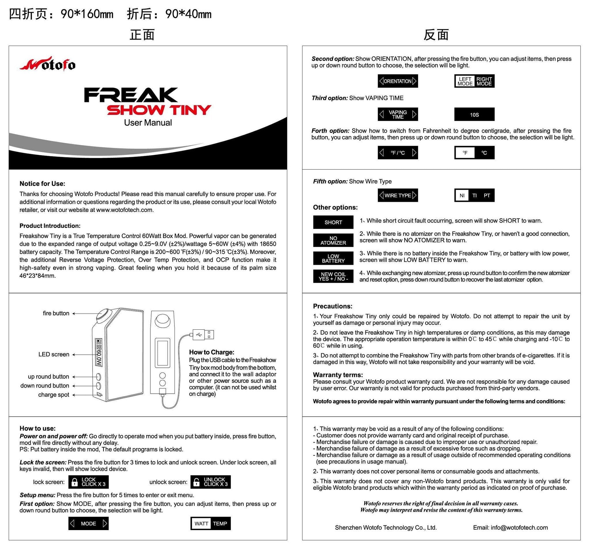 The Freakshow Tiny is the latest entry in the world of Temperature-Controlled box mods. This is Wotofo's first digital APV mod and clocks in with 60 watts of power, with support for Ni200, Titanium, and Platinum coils. This is a very compact box perfect for busy vapers. It uses a single 18650 battery which is sold separately, and features a spring-loaded brass 510 pin for maximum compatibility with a wide range of TC-ready atomizers.