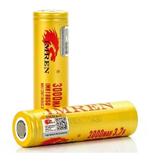 IMREN IMR18650 Gold Batteries are 3000mAh, 3.7V, 40A with flat-top and height of 18mm making it a perfect fit for 22-23mm sized devices. These long-lasting batteries are rated at 40 amps by IMREN with a max continuous 20 amp discharge.