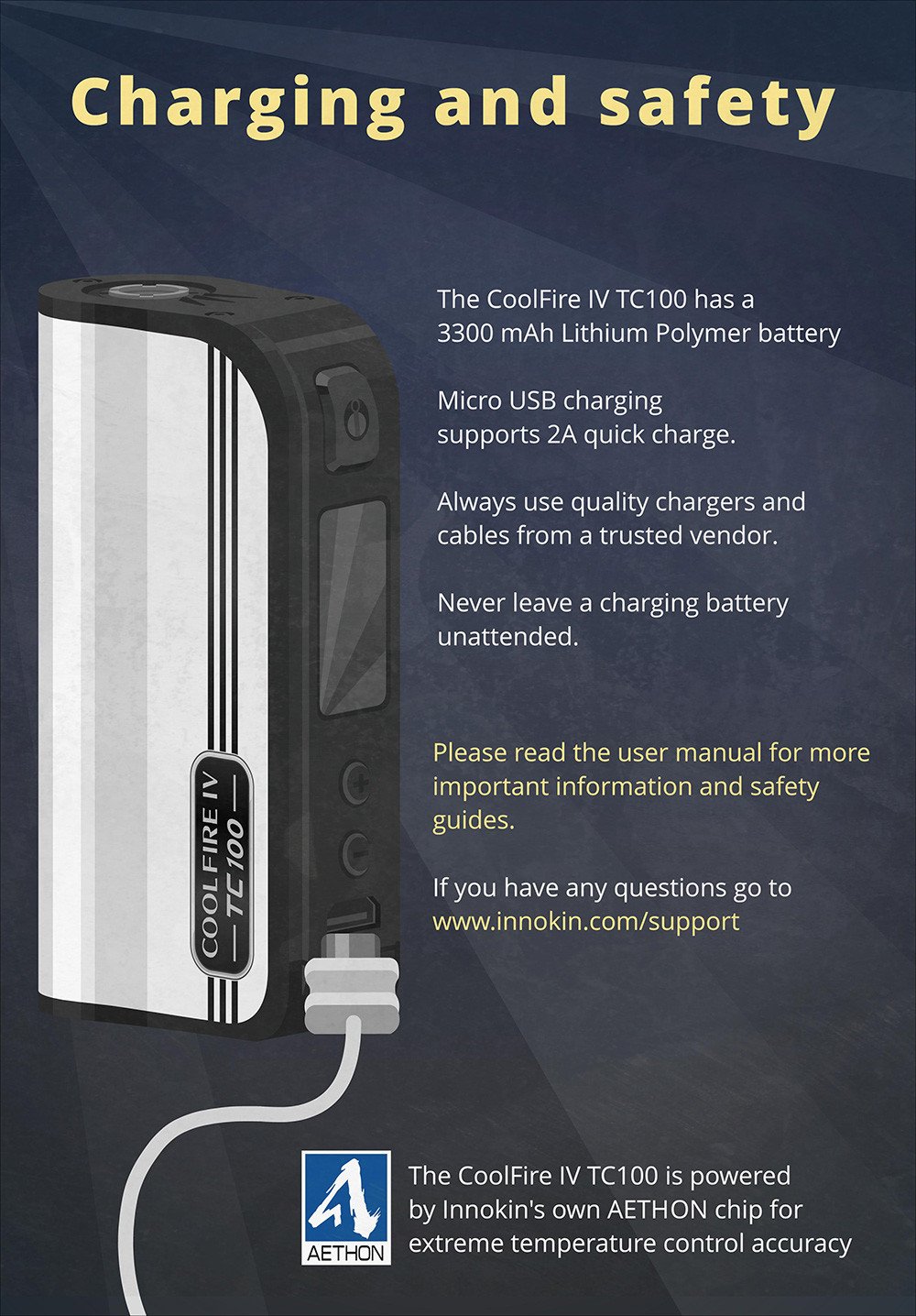 The Innokin Cool Fire IV TC 100W mod is powered by the new Ultra-fast AETHON chipset with a whopping 100 watts of pure power. Vape more quietly and efficiently with ClearWave noise cancellation technology. Compatible coil modes include Variable Temperature Control, Titanium, Nickel200, and Stainless Steel in TC Mode. Fast 2Amp Charging, Precision Power Control, advanced safety protections and ‘Vape while charging’ pass-through capabilities. The Cool Fire IV TC 100W has a flush 510 connection, gold-plated spring-loaded pin and durable stainless steel threading. Stylish and powerful with a long-lasting 3300mAh built-in battery will last all day. This durable and ergonomic design fits comfortably in your hand and conveniently placed power button.