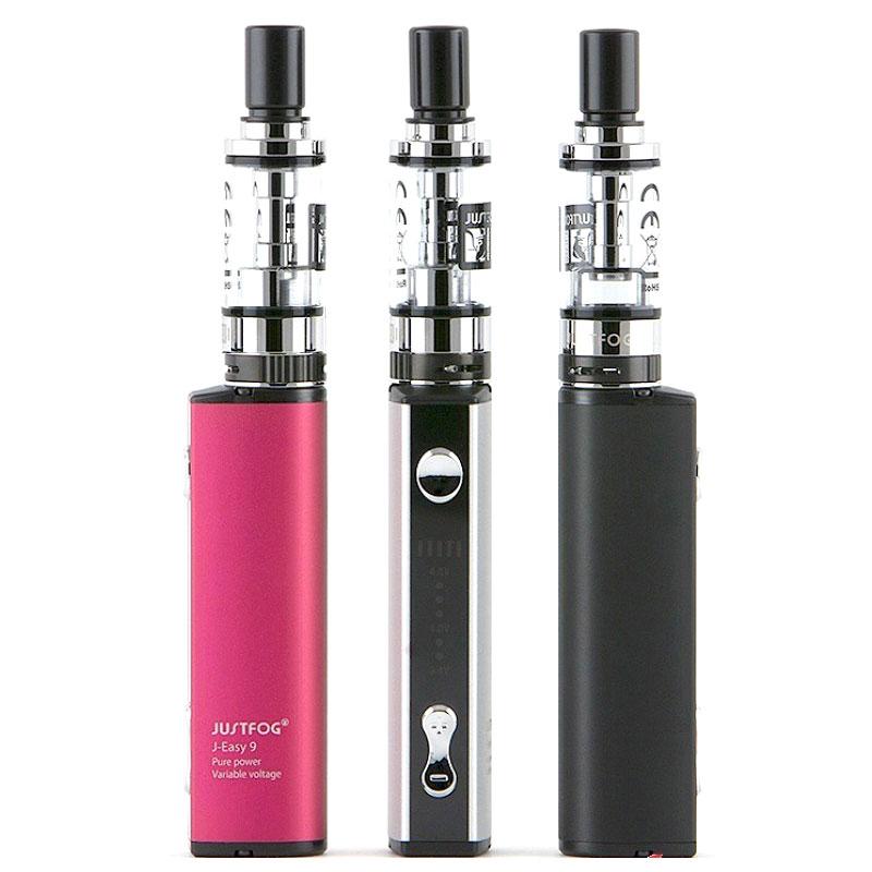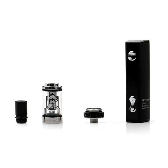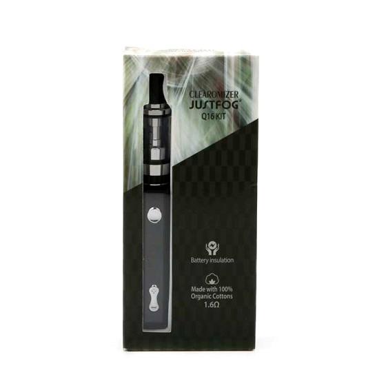 The Justfog Q16 vape kit includes a J-Easy 9 mod with a long-lasting built-in 900mAh battery, variable voltage settings, easy one button operation and topped with a 2ml Pyrex glass tank Q16 clearomizer/atomizer using bottom airflow control and bottom-fill design.