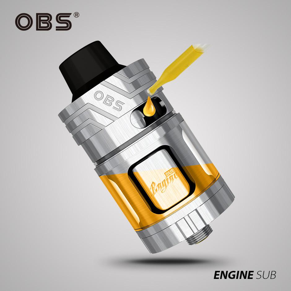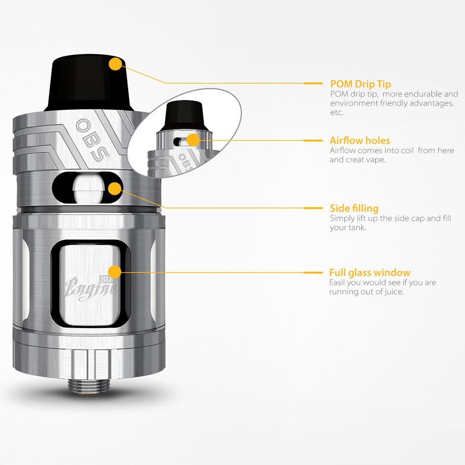 The OBS Engine SUB is a sub-ohm tank atomizer with replaceable coils, unique airflow circulation system, convenient side-fill tank and large 5.3ml liquid capacity tank reservoir. The Engine SUB tank atomizer uses large Notch style vertical coils made with organic cotton and rated for 40 to 100 watts.