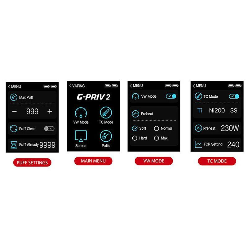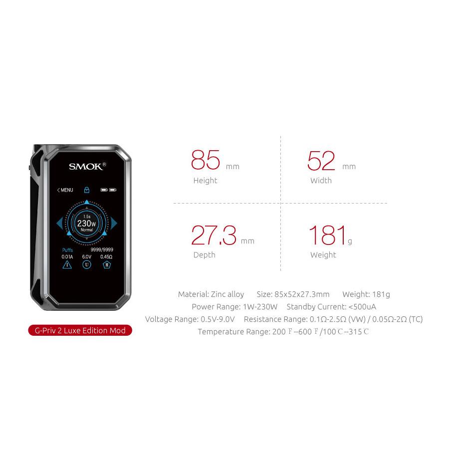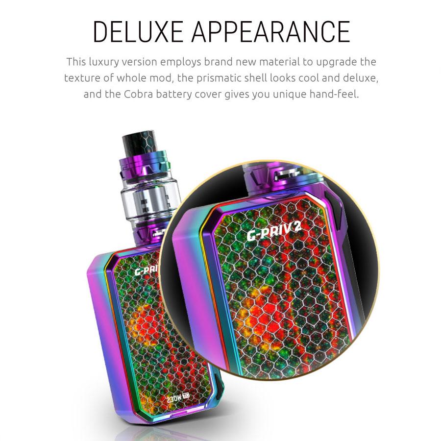 The G-Priv 2 230W TC LUXE edition is an upgraded version of the G-Priv 2. The cobra-like appearance of this mod is slim and stunning, complimenting the highly sensitive 2.0 touch screen.