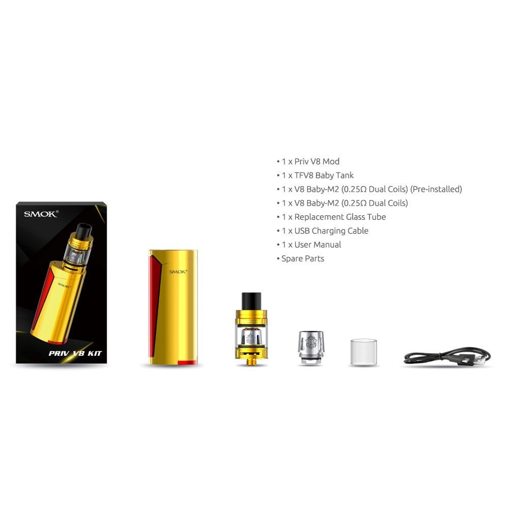The SMOK PRIV V8 is a powerful pocket-friendly vape mod powered by a single 18650 battery (not included) and features a large firing button that's easy to operate with it's simple one-button activation. The Priv V8 mod can easily push 60 watts on coils with resistance as low as 0.15ohms. It has dual LED indicators for charging status, working status while vaping, incompatibility codes, protection features and battery life. You can also recharge your batteries within the Priv V8 mod via micro USB although an external 18650 battery charger is recommended for optimal charging. This crisp set up comes with a TFV8 Baby Tank atomizer that can hold 3ml of your favorite e-liquid. The Priv V8 kit tank comes with V8 Baby-M2 coils to give you massive flavorful clouds for an ultimate vaping experience..