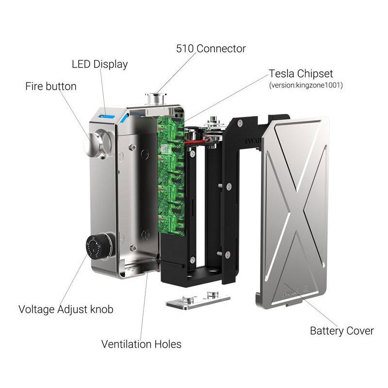 The Tesla Invader 3 box mod is a small yet powerful little device with a maximum output power of 240 watts. The Invader holds the perfect balance between high power, aesthetics, ergonomics and flavor. The Tesla Invader III is a dual 18650 box mod using 2 high drain Li-ion batteries in series with advanced chipset for generating high power on demand while protecting against short-circuits providing you the perfect vaping experience.
