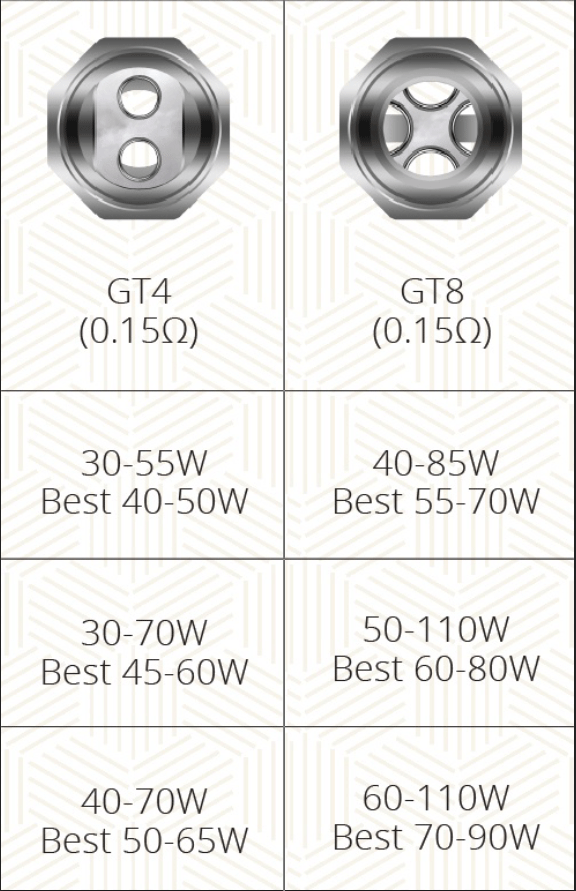 - GT2 Coil Core: 0.4ohm / 40-80W