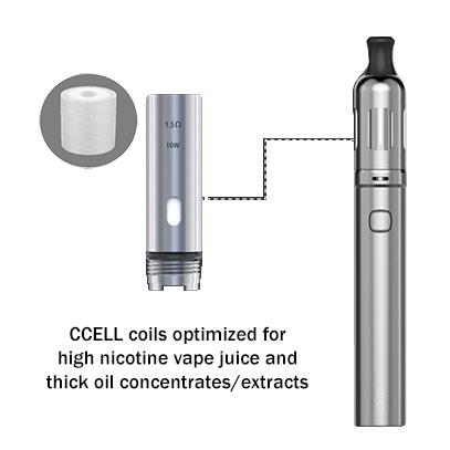 Vaporesso Orca Solo supports cCELL coils suitable for high nicotine vape juice and salt nics favoring high nicotine satisfaction and compatible with thick oil concentrates and extracts.