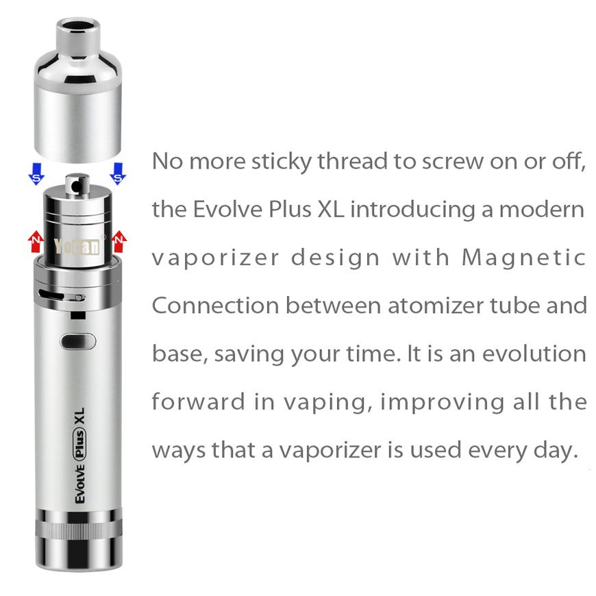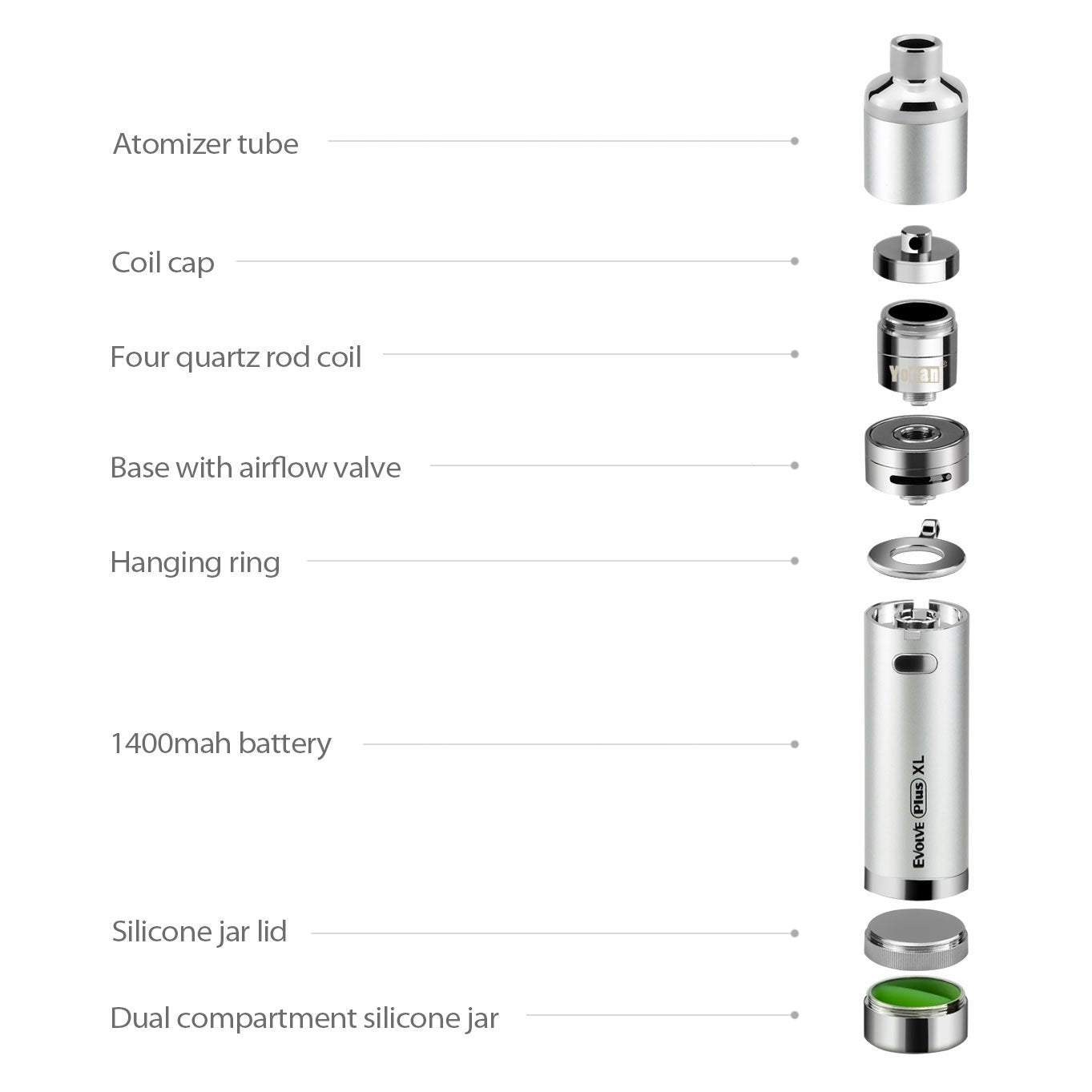 The Yocan Evolve Plus XL kit is not merely a reworked Evolve Plus vape pen; it’s a completely reinvented vaporizer! The Evolve Plus XL packs more power with a longer-lasting 1400mAh built-in battery to power it's awesome new Four (4) Quartz Rod Coil. That's 4 coils heating each puff for massive vapor action Jackson!