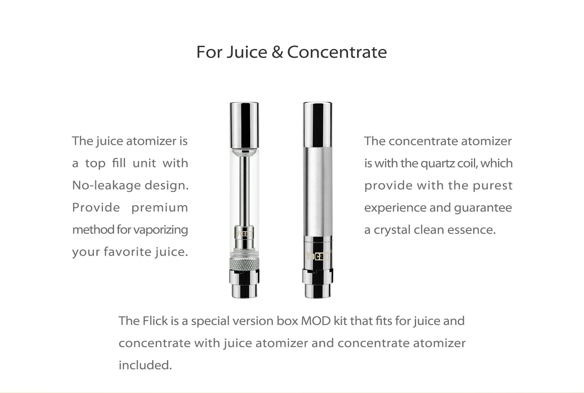 New from Yocan is the Flick 2-in-1 kit. This 2-in-1 kit comes standard with two atomizers, one for e-liquid or thick oils and the other for wax concentrates. The device opens with a satisfying flipping of the lid.