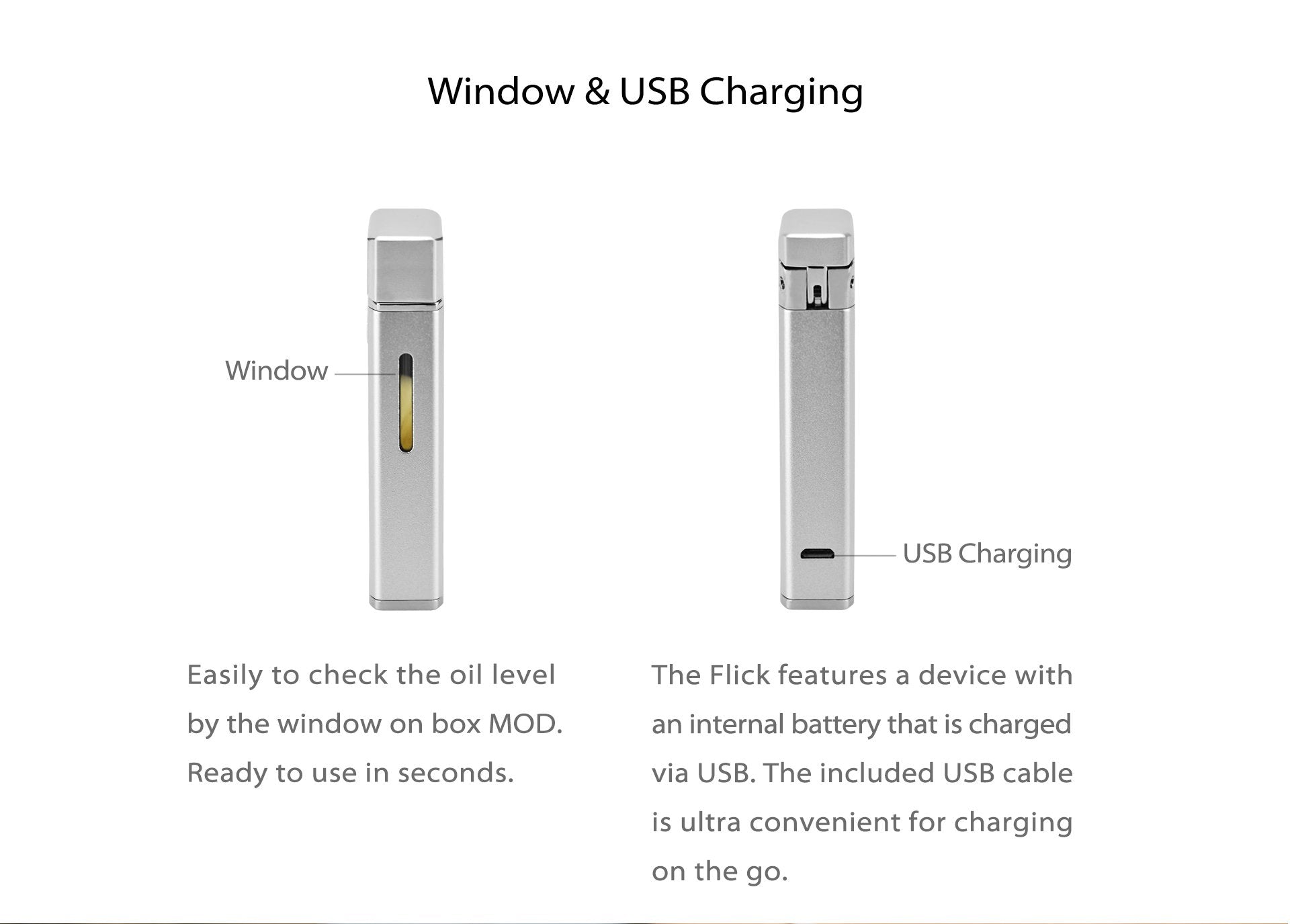 The Flick comes with everything that you need to get started using your favorite concentrates in one sleek and discreet unit. Just add sauce.